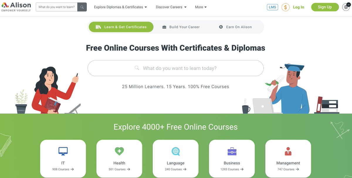Alison offers free online courses from world-leading experts. It has over 13 million users.